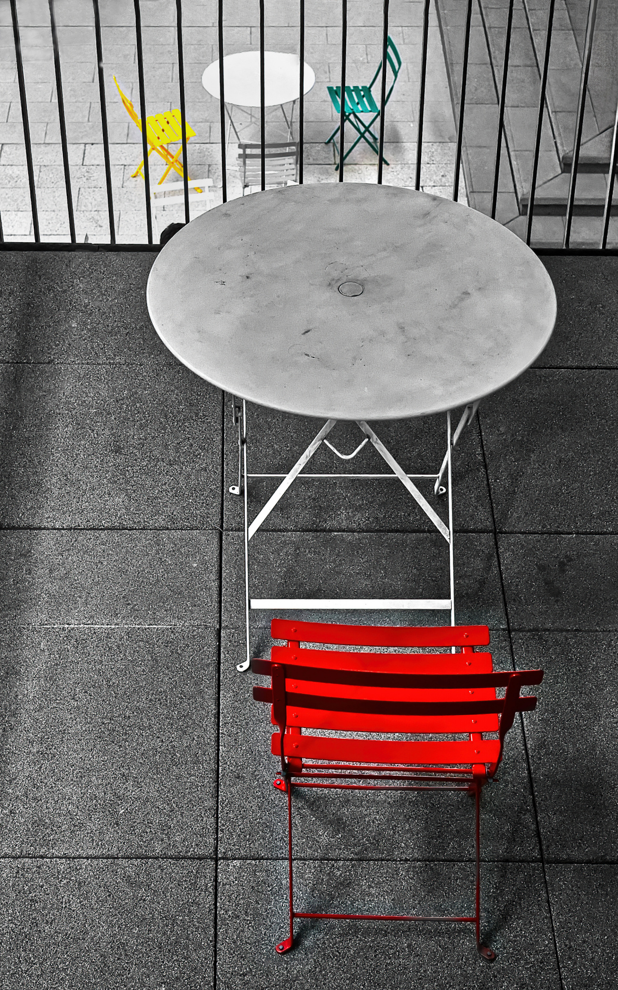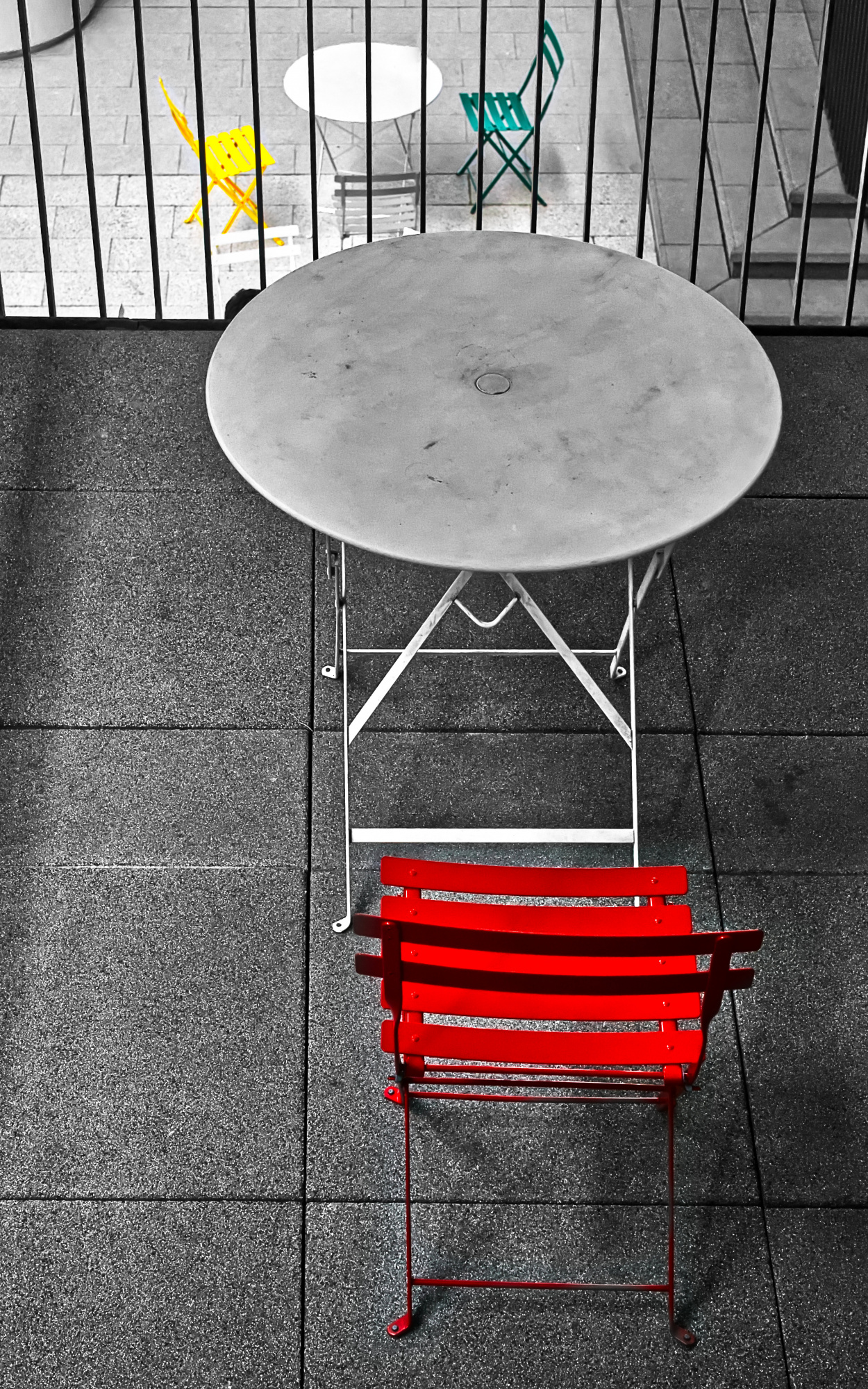 It's my habit to look for meaning, purpose, or story in a photograph. The story here is about a 'table for one' - an empty chair and table contrasted with the table for two in the background. We can see the table for two, but we can't get to it because there's a fence or railing that prevents that. It's a sad story of loneliness. If there were a couple sitting at the lower chair, or if we imagine them there, it would complete the story.