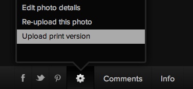 On several occassions orders to print customers have been delayed or cancelled because we were unable to receieve the high res files from the photographers in time, so it's very important that you upload all photos made available for sale in high resolution. Click "Upload print version" in the cog wheel below the photo to upload in high resolution. It's ok to upload in JPG.