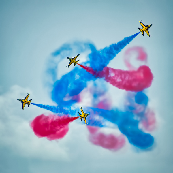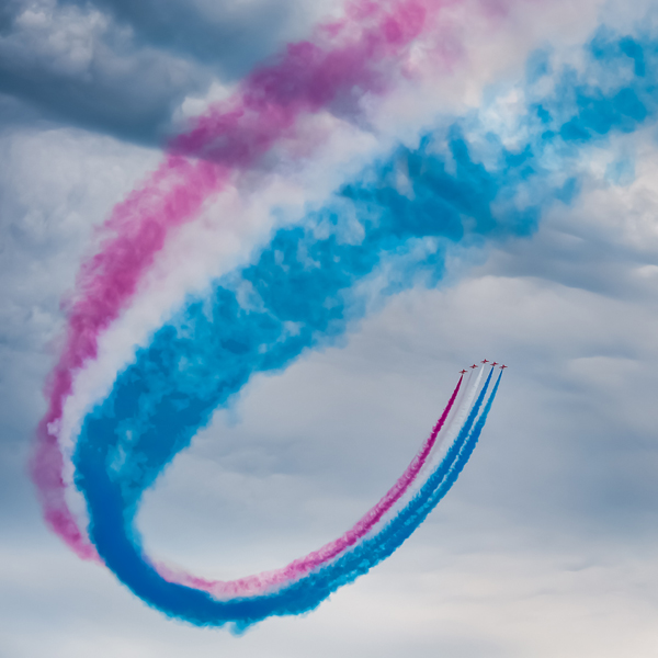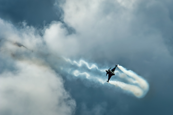 I try to look at aircraft photography as an art form where all the usual photographic elements apply: good composition, effective lead-lines (from clouds, vapour or smoke trails), space for the aircraft to move into, unusual orientations, exciting routines, dramatic skies and cloud patterns. Getting all those elements in place with good technical quality makes it a challenge.