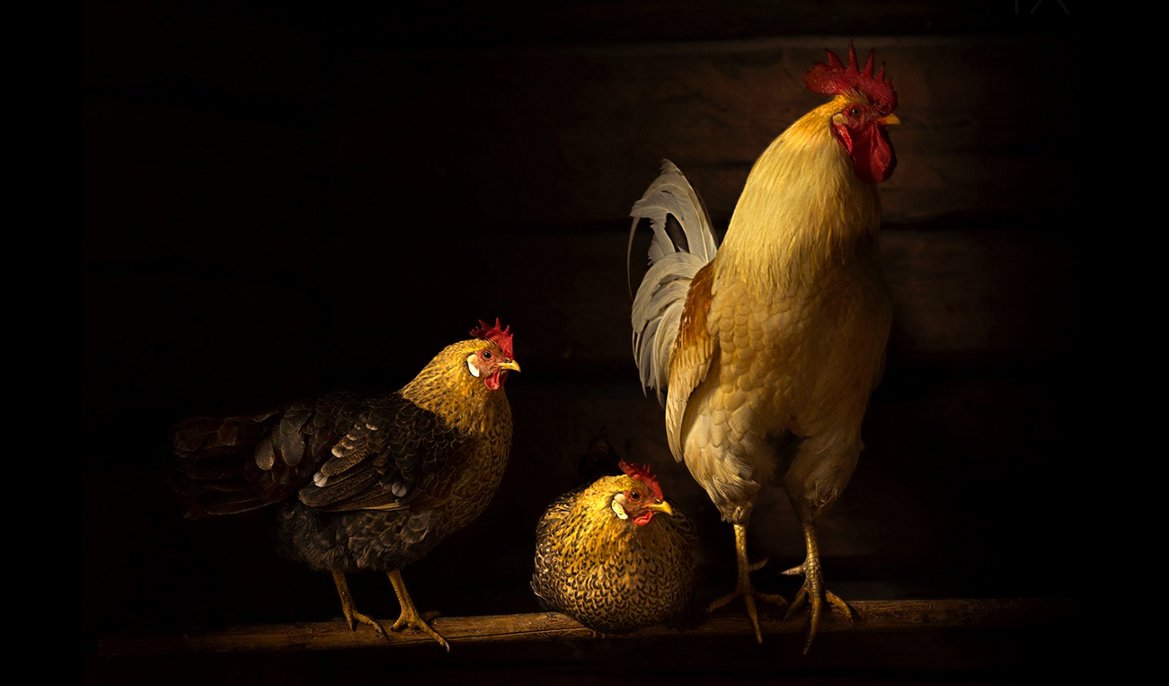 I zoomed in to fit the chickens in the frame and get rid of disturbing elements such as the window and a lamp hanging from the ceiling. By the time I had taken four photos, the chickens were all over the place. I reviewed the photos on the camera screen, and this one already looked like a painting. This was probably due to the texture of the feathers of the rooster, combined with some slight blurring from the slow shutter speed I had used. This photo was sharper than the others since the chickens were sitting still at that point. I knew I could enhance this painterly look even more with post-processing.