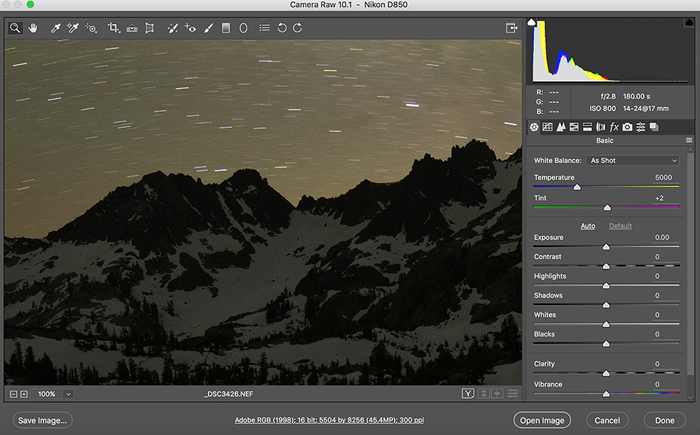 (a) Long exposure for Minaret Lake: 180 seconds with camera long exposure noise reduction on.