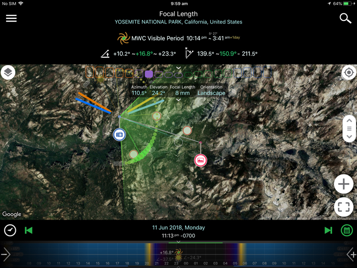 Since I had been to Minaret Lake in 2013, I knew where would be a desirable shooting location. To make our plan as precise as possible, we used Planit! to set our preferred camera location and the scene location that included Minaret peaks into the frame. Then by sliding the time-bar, the app would automatically show the prediction of the Milky Way appearance position in relation to the pre-defined composition.