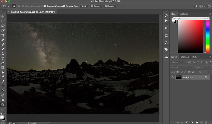 Taking Minaret Lake as an example, by using “Photomerge” function in Photoshop CC 2018, I did two photo merges, one for the series of 9 foreground photos, and the other 9 photos for the sky. The results are shown below: