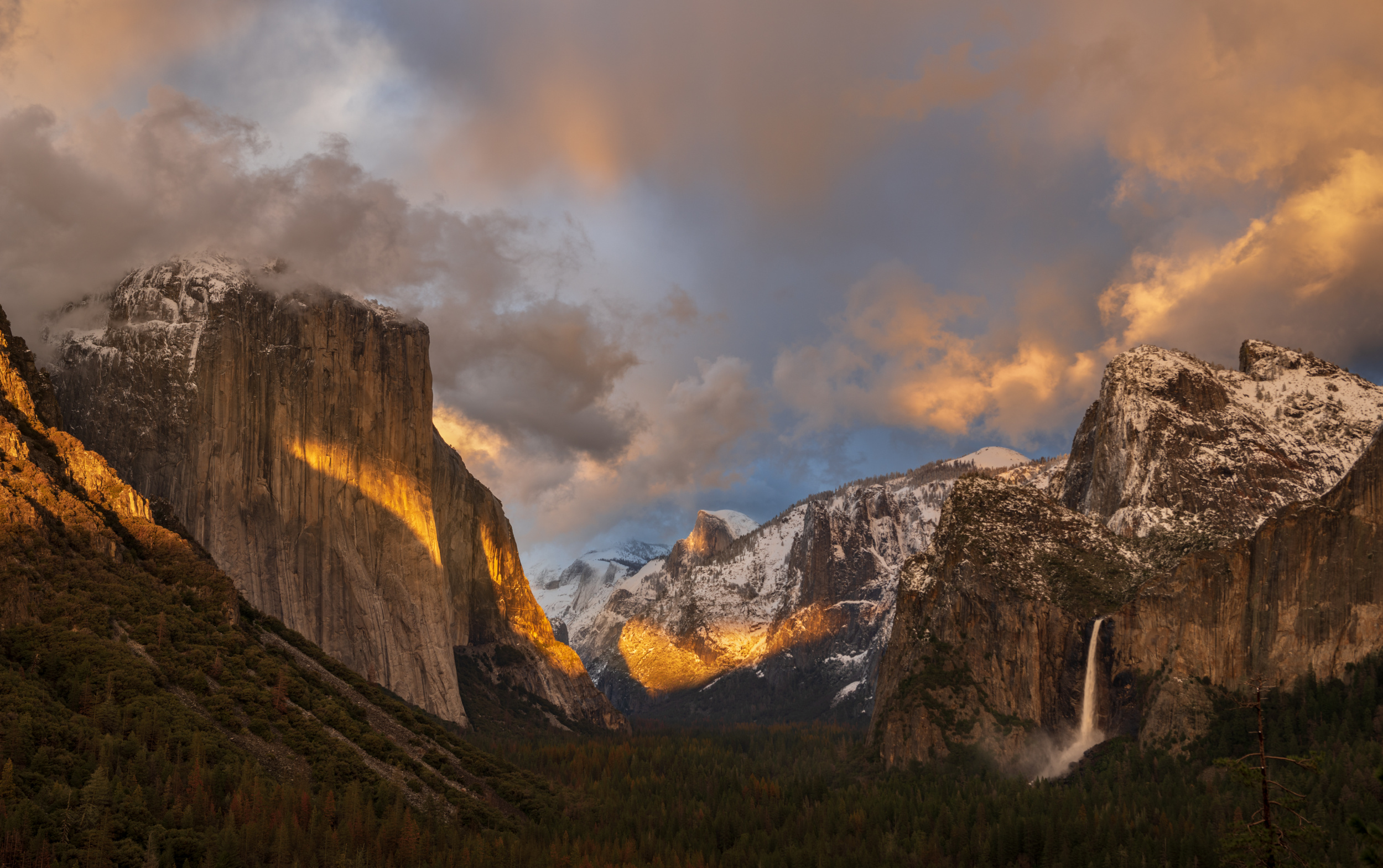 Our favourite photo is the one taken at the Tunnel View Yosemite NP.  hat day, a lot of people were waiting at that famous spot. The weather was changing all the time. Sometimes, It was sunny with partial clouds; sometimes it was drizzling or snowing.  More and more people left, predicting it would be cloudy and no hope to see the golden light at sunset.  About 30 minutes before the sunset, the last two so called professionals from Beverly Hills left though we tried to persuade them to stay. By the end, we were the only ones standing with our tripod and camera on that big spot which could hold 50 more photographers. Suddenly, a golden sunbeam hit the bottom of the valley, and then it was moving upward on El Capitan.  More golden sunbeams showed their interest in Half Dome and Cathedral Rocks etc.  Some of the moving clouds enjoyed sunset light, too.  What a beautiful and fantastic drama performing just in front of us!  We were so excited and kept the shutter clicking. We were in a very happy mood!  Persistence and patience played a big role here.  We have been to this location many times, but this is one of the most exciting moments.