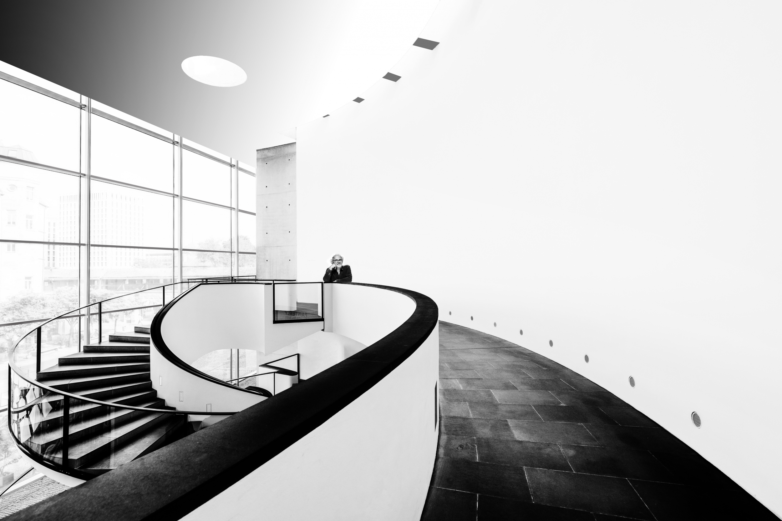 I was only able to realize this photo because I worked / processed after developing it. The main photo is a view on the ceiling in a German museum and the person is a visitor but (of course) on a completely different location in the museum. This way I could was able to create the illusion that the person was looking through different windows. Plus, white architecture is one of my favourites.