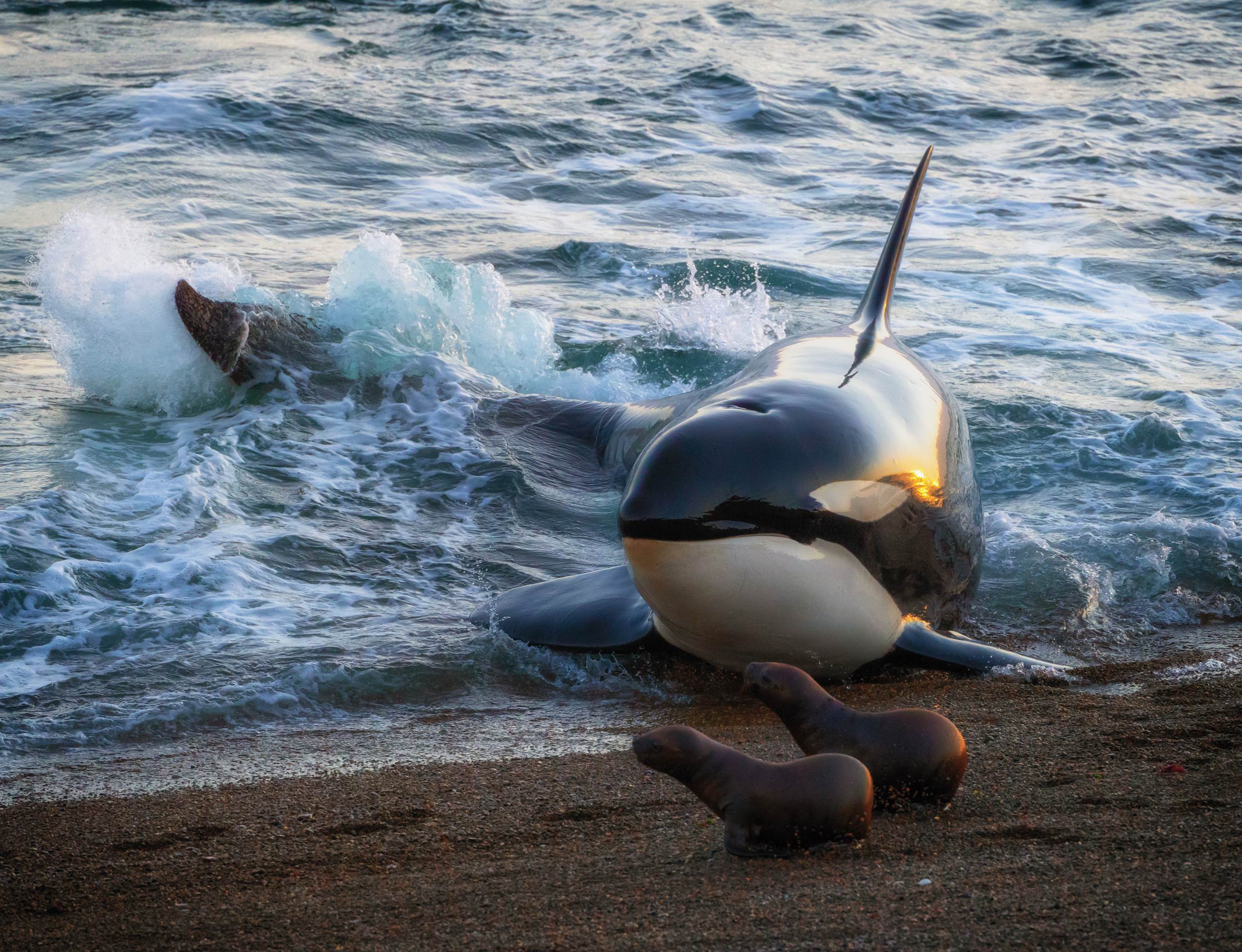 ‘Morning attack- A pregnant orca attacks two sea lion pups on the beach in the early morning’